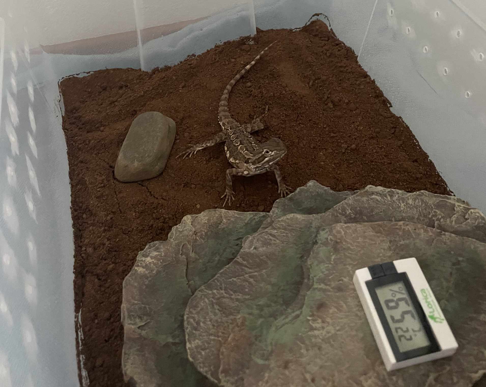 Dann hat sie mich in mein Winterquartier verfrachtet. Für das Winterquartier hat mein Frauchen eine SAMLA-Box mit Deckel von Ikea gekauft. In die Box und den Deckel hat sie ganz viele Luftlöcher gebohrt. Das war mit der Handbohrmaschine gar nicht so einfach. Oli, der nette Herr aus der Zuchtstation, hat ihr für das nächste Mal den Tipp gegeben, einen Lötkolben zu verwenden. In die Box kam noch ca. 10 cm von meinem etwas feuchten Terrariensand, meine Höhle und eine kleine Trinkschale, sowie ein Hygrometer, damit man die Temperatur und Luftfeuchtigkeit jeweils schnell kontrollieren kann.